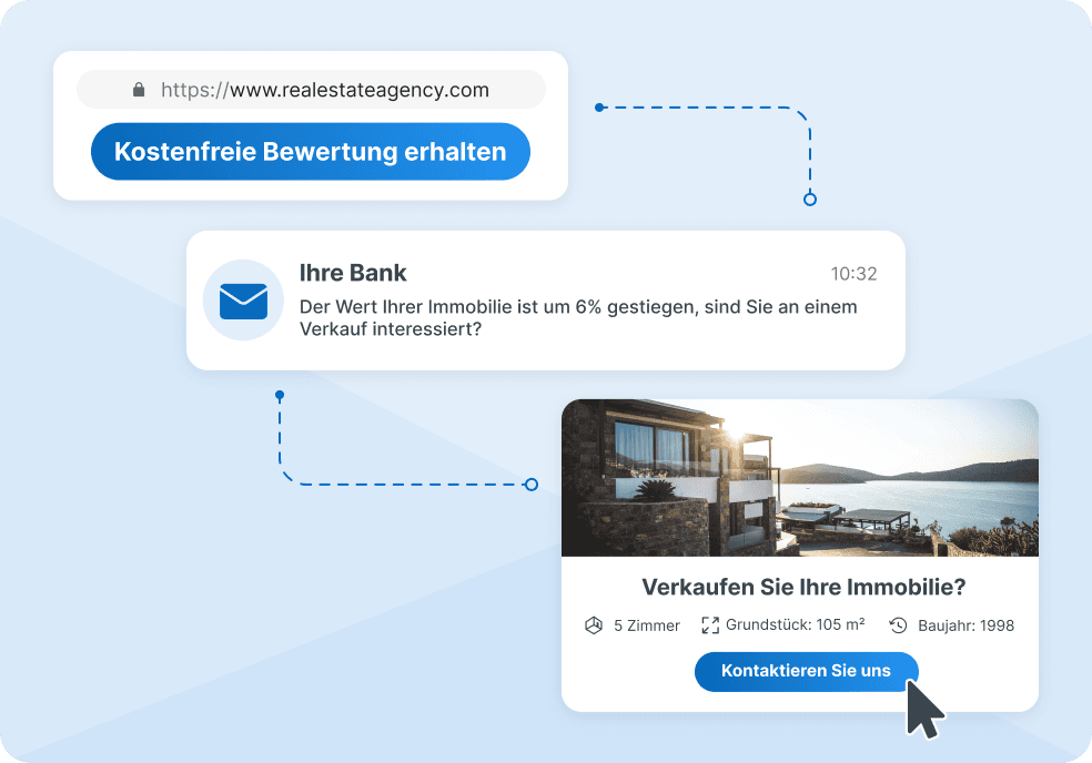 Der Austausch von aktuellen Immobiliendaten mit der Kundschaft stellt für Banken und Finanzdienstleister:innen einen entscheidenden Touchpoint dar, um Beratungsleistungen anzubieten, die darauf abzielen, den Wert ihrer Immobilien zu erhalten oder zu steigern. Durch die Nutzung geeigneter Tools können verschiedene Effekte für die Kundschaft visualisiert und darauf abgestimmte Versicherungs- und Finanzprodukte in den Mittelpunkt gerückt werden.