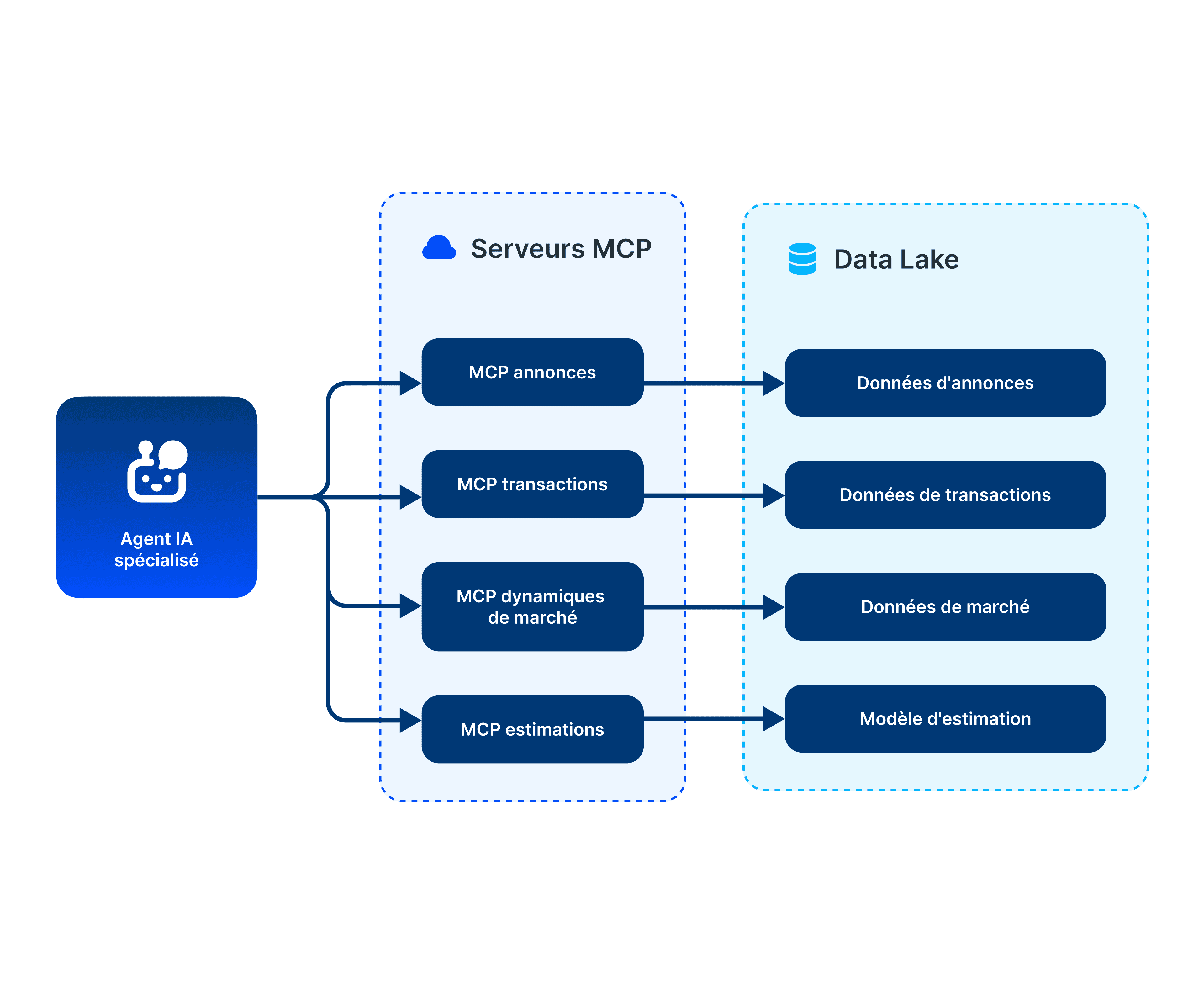 Pour garantir la précision, la sécurité et la fiabilité de nos agents IA, nous avons conçu notre propre MCP. Il permet aux agents IA d’accéder aux insights immobiliers depuis notre infrastructure. Les MCPs constituent la couche d’infrastructure reliant les agents à des données vérifiées, en temps réel et à grande échelle.