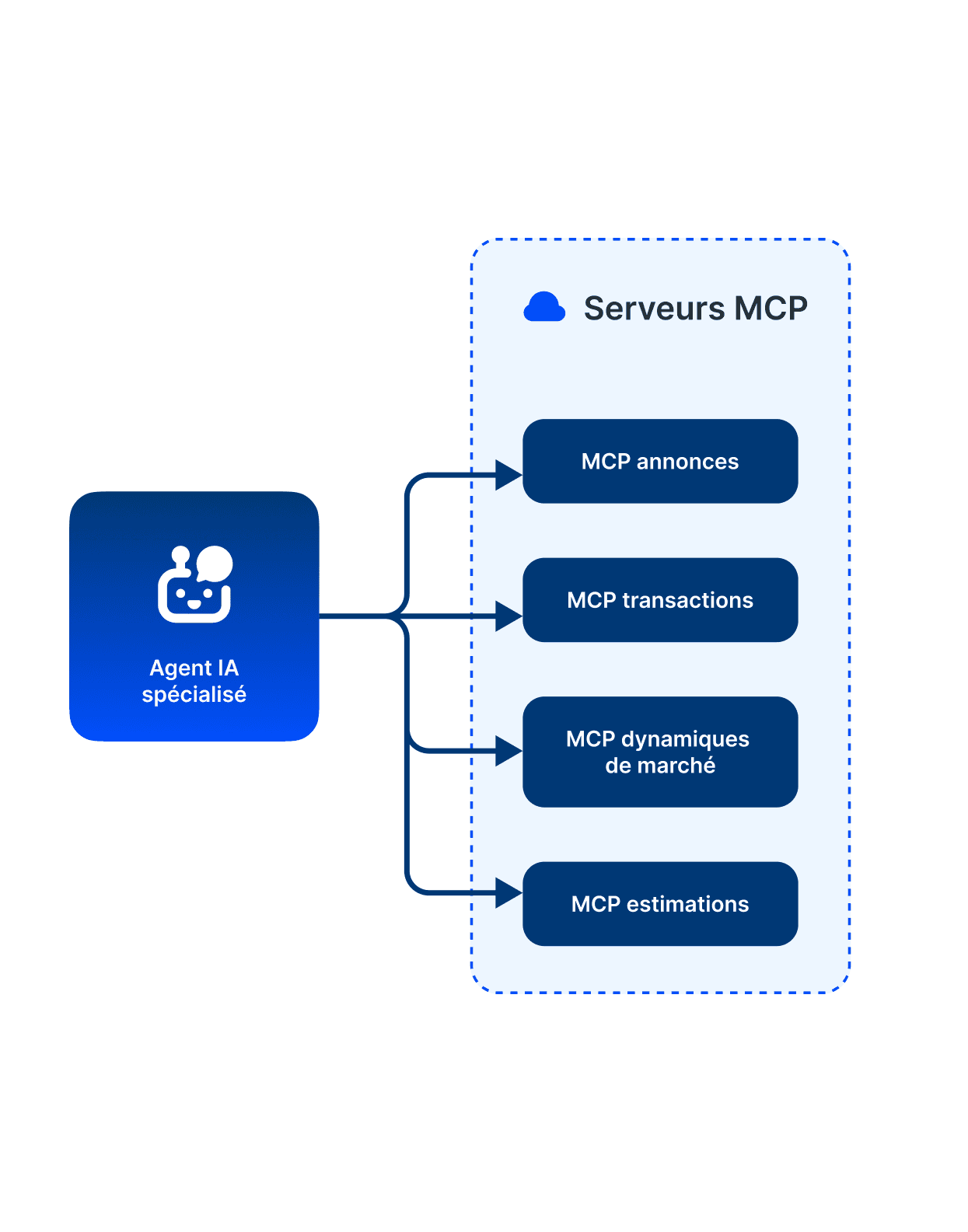 Contrairement aux API, qui servent principalement à connecter des applications, les MCPs sont un protocole permettant à un agent IA d’accéder à des données et à des services tiers. Ils permettent de déployer des agents capables d’analyser de manière cohérente les annonces, les valorisations, les transactions ou les dynamiques de marché.