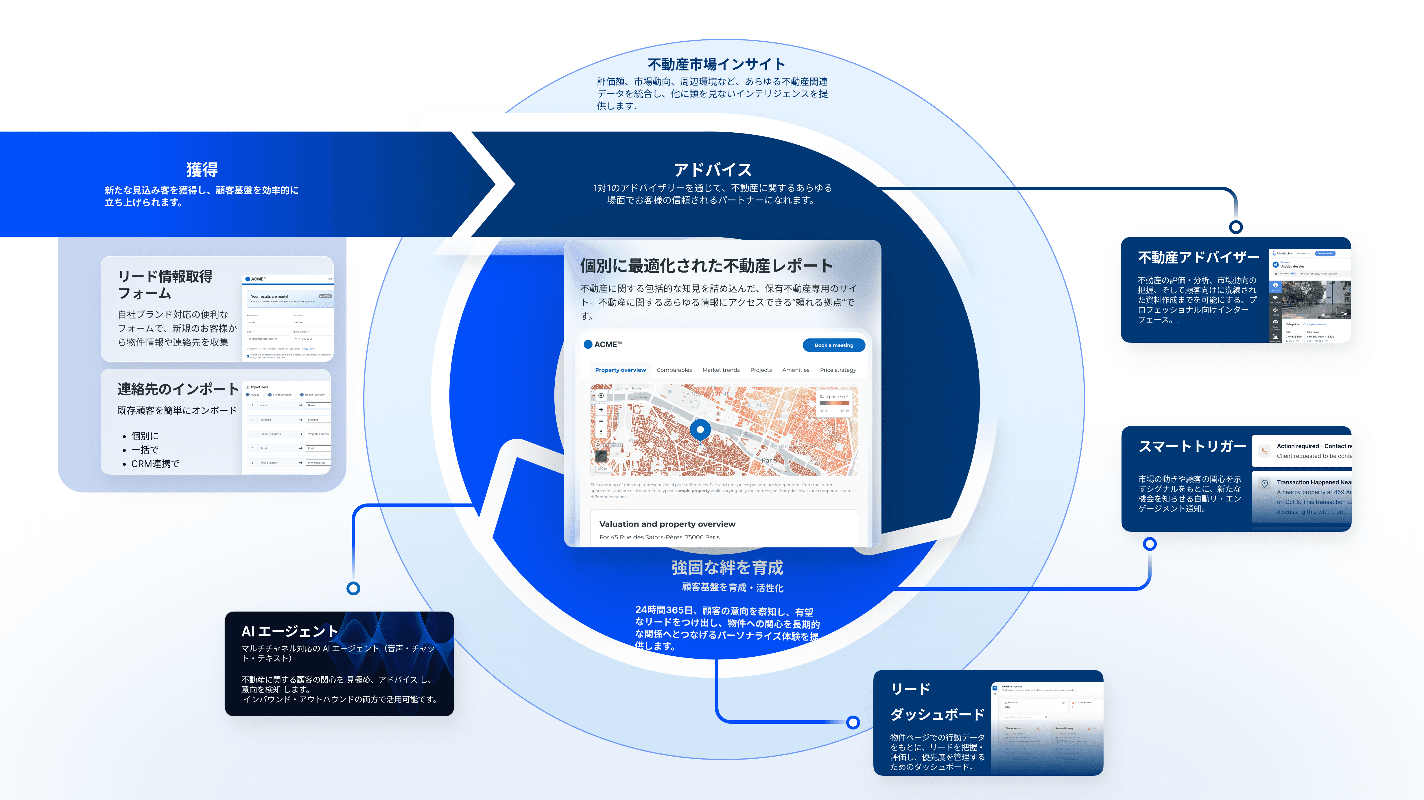 PriceHubbleのAI エージェントスイートは、11カ国にわたる豊富なデータベースと、金融・不動産分野における深い専門知識を強みに、顧客獲得から契約締結までの一連のプロセスをシームレスに支援します。