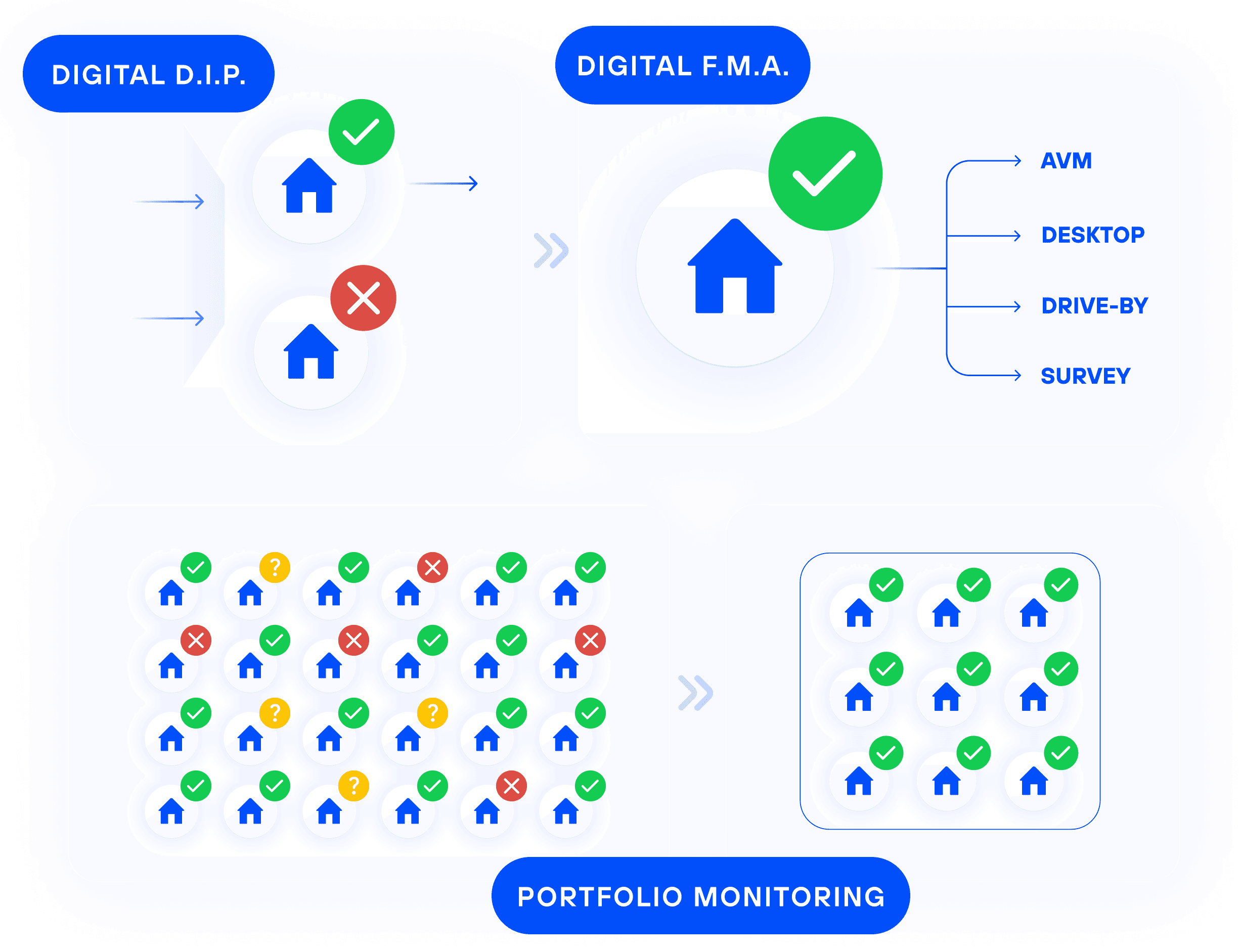 Essential for the loan origination stage, our property assessment module acts as both a digital D.I.P. and digital F.M.A.. It instantly screens properties against lending rules, LTV criteria and title deed issues, then performs a deep-dive analysis of key attributes, risks and valuation. The system triages applications to determine whether an AVM, desktop survey or full physical inspection is required, ensuring you only invest resources where it matters most while accelerating time to offer.